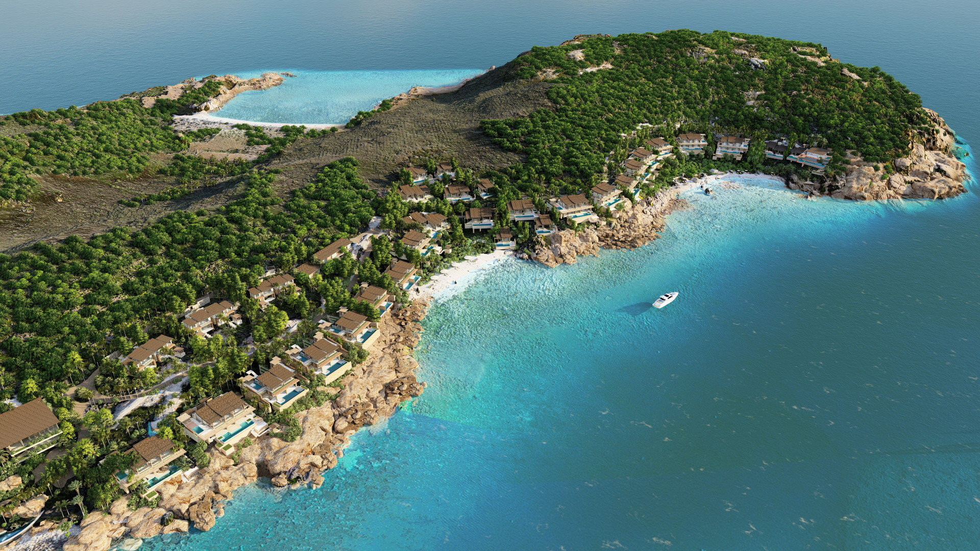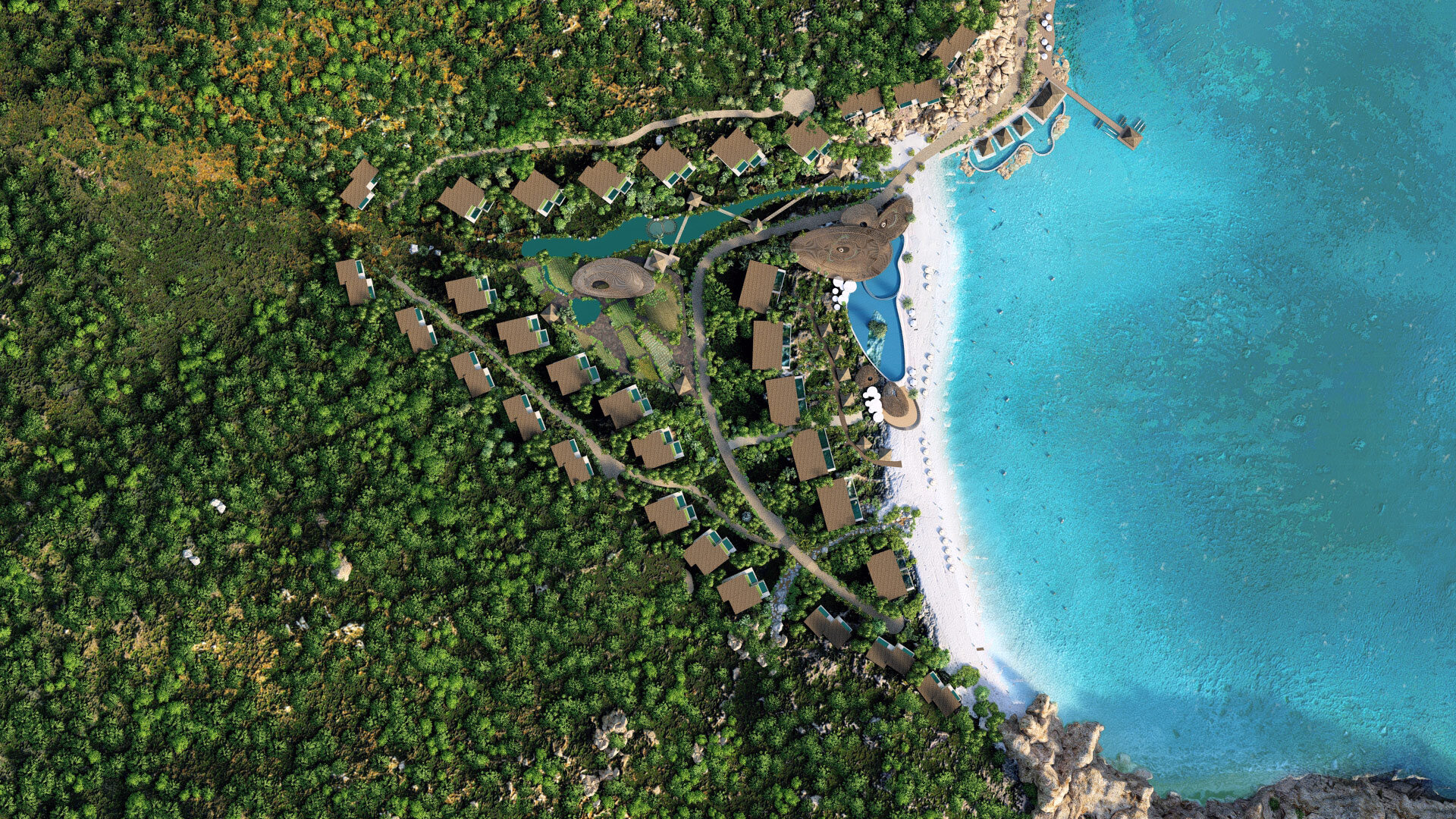 The project is divided into three distinct areas: Promontory Village in the north; The stream village is in the center and the sea village is in the south.